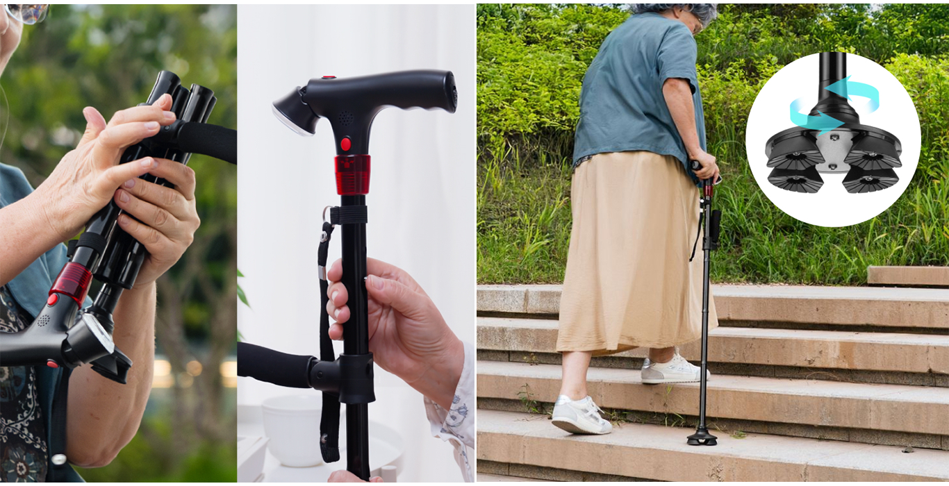 🏞 ️Stable on Any Surface – Its wide quad-footed non-slip base grips the ground like a hiking staff, keeping you steady on tiles, grass, stairs or uneven ground. Even stands on its own.